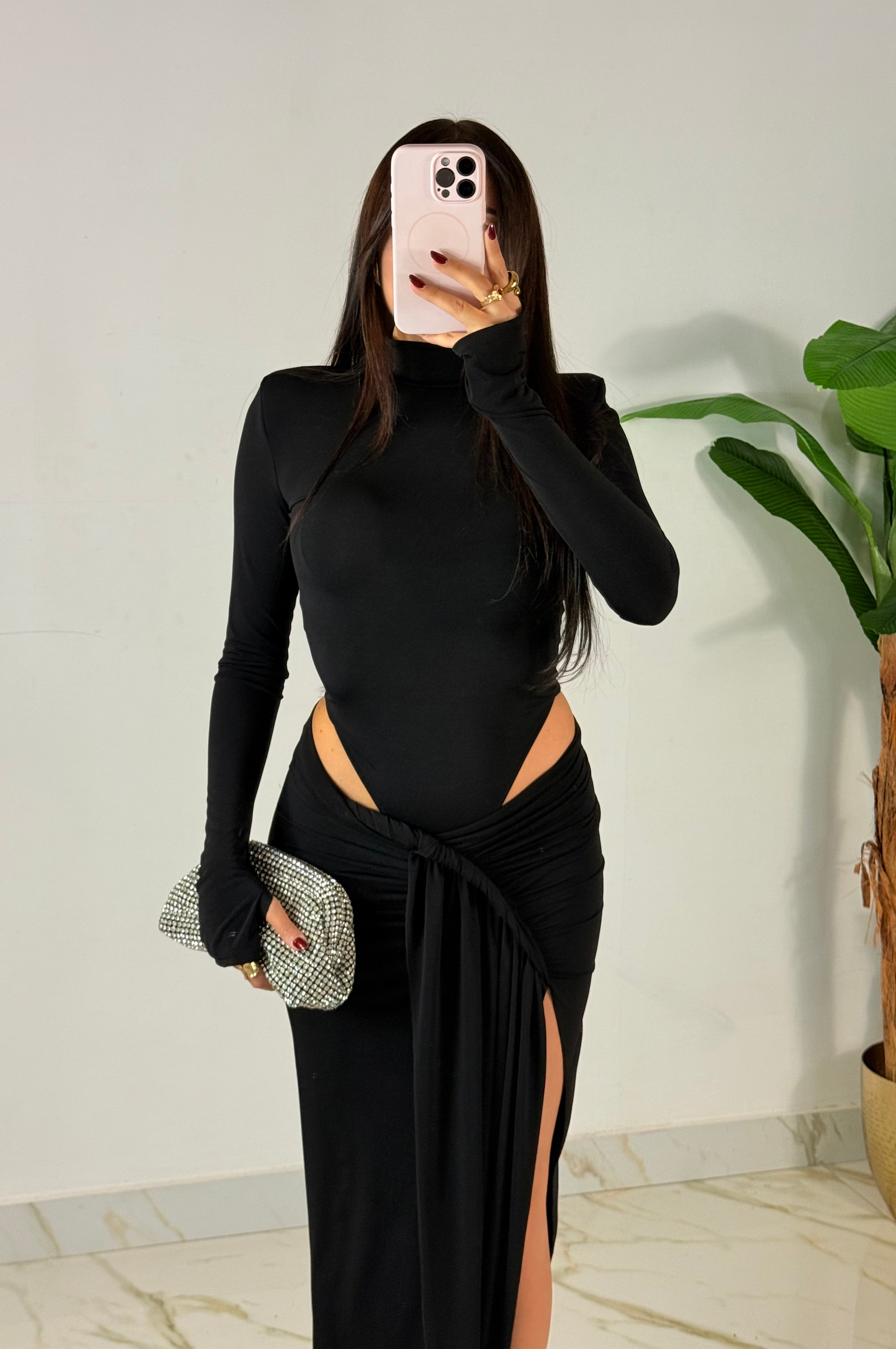La modella è alta 1.63, il coordinato è taglia unica e veste da una 38 a una 46.