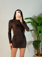 Abito con scollo profondo, effetto drappeggiato e super elasticizzato. Veste fino ad una 44/46